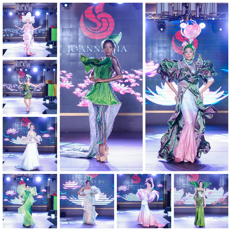 舞台中央,Joanna Jia 在模特们的簇拥中缓缓登场。她身着自设计的压轴礼服,象征莲花的优雅与坚韧,向观众鞠躬致谢。现场掌声雷动,气氛达到高潮。观众无不被作品的灵巧构思与深刻寓意所打动——那是一种跨越文化与语言的美,一种将“莲”之意象转化为女性力量与精神象征的时尚哲思。