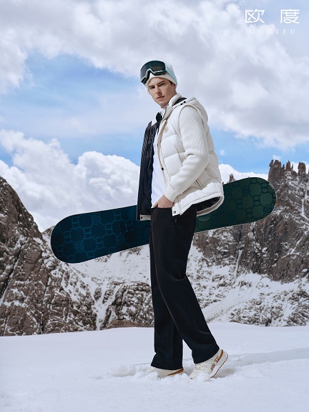 本季,欧度从四川西部冬日的自然光影中汲取灵感,采用了象征山林风景的绿、蓝、白等治愈色系,以及大地色、黑、灰等沉稳而富质感的雪山色系,广泛应用于大衣、羽绒服、毛衣等核心单品。